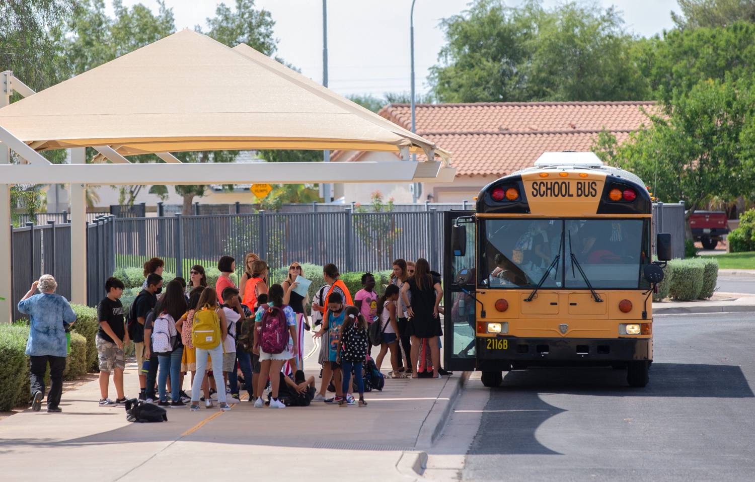 Students board a school bus after finishing their first day at Sanborn Elementary School in Chandler on July 21. Chandler is the first Arizona district to return to school.Sanborn Elementary School
