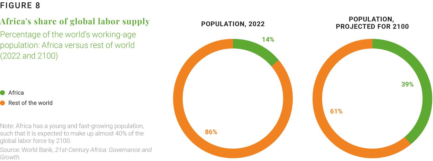 Africa1 stands at a pivotal juncture: Between 2025 and 2050, the continent is set to undergo one of the fastest expansions of the working-age population in world history, with total population rising from about 1.4 billion today to as many as 2.5 billion by mid-century.2 Central to this surge are an estimated 830 million youth aged 15–353—an unprecedented concentration of young talent. Will this demographic dividend fuel transformation or deepen fragility? The answer lies in Africa’s ability to equip its youth with the skills, health, and education to compete effectively in a 21st century labor market. Only by investing in its youthful population will Africa claim a prosperous 21st century. This youth potential can only be unlocked when personal competencies are matched by state systems that provide stability, good governance, and an economy dynamic enough to create opportunities.