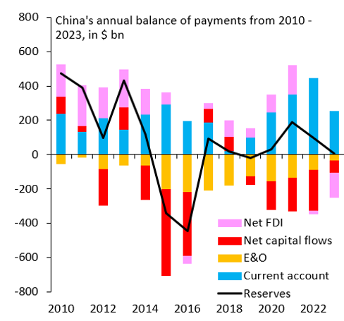 China’s goods exports in 2023 were near record levels, yet accumulation of official foreign exchange (FX) reserves was essentially zero. This combination is unusual. Ordinarily, strong exports imply a large current account surplus, which historically has meant rapid build-up in FX reserves. This blog post—the third in our new Global Economy and Markets series—examines China’s balance of payments (BoP) for clues. Conceptually, there may be at least three drivers. First, China could be stockpiling dollar-invoiced commodities to reduce the current account surplus, thereby reducing upward pressure on reserves. Second, it is possible that what in the past counted as official intervention is now being channeled through state banks (i.e., is being classified as a capital outflow rather than official intervention). Third, net foreign direct investment (FDI) may be shifting against China. Empirically, it is the third channel that is most important. Unfortunately, data transparency is poor, which means it is hard to disentangle if this shift is due to foreign businesses pulling back or China’s outbound direct investment. Our reading of the data is that it is primarily the latter, consistent with China trying to financially decouple from the U.S.