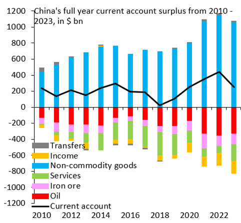 Figure 2. China’s full year current account surplus from 2010-2023, in $ bn.