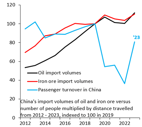 Figure 3. China’s import volumes of oil and iron vs. number of people multiplied by distance traveled from 2012-2023, indexed to 100 in 2019.