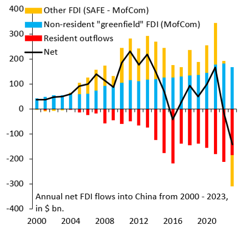 Figure 4. Annual net FDI flows into China from 2000-2023, in $ bn.