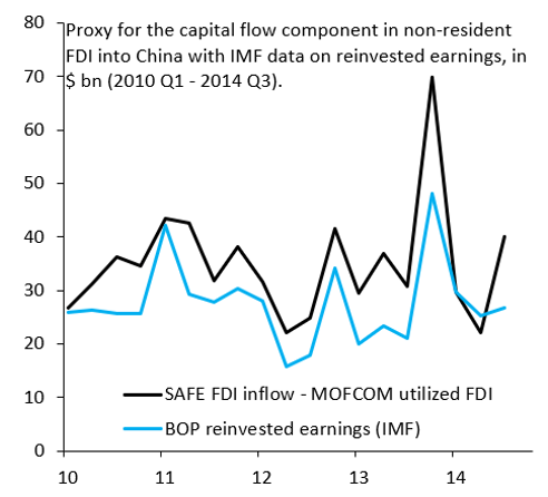 Figure 6. Proxy for the capital flow component in non-resident FDI into China with IMF data on reinvested earnings, in $ bn (2010 Q1-2014 Q3).