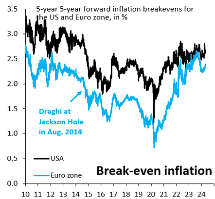 Figure 3. 5-year, 5-year forward inflation breakevens for the US and eurozone, in %