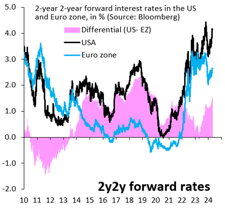 Figure 4. 2-year, 2 year forward interest rates in the US and eurozone, in %