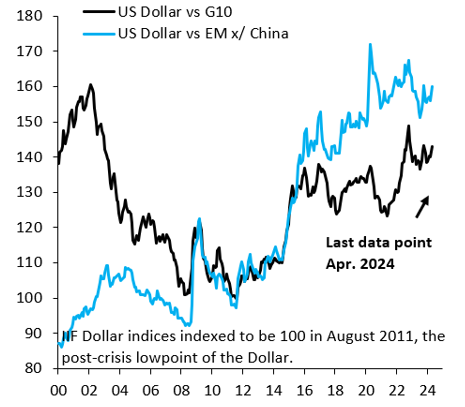 Half a year ago, debate at the IMF/World Bank annual meetings in Marrakech centered on geopolitics, with a lot of concern that the global security situation was spinning out of control. This was not the central theme at last week’s IMF/World Bank Spring Meetings. To be sure, there was lots of debate on the Middle East and Ukraine, but neither were seen as “systemic.” Instead, focus was on cyclical outperformance of the United States vis-à-vis its peers and the possibility that this might keep U.S. inflation stickier than elsewhere, preventing the Fed from cutting rates even as other major central banks begin easing cycles. This combination of factors made sentiment the most dollar-bullish in a very long time, with the U.S. election and geopolitical risk seen as additional sources of dollar strength. Not much of any of this is priced into markets. Option-implied volatilities for the euro and Mexican peso, for example, are at very depressed levels. This means volatility may rise, perhaps sharply, as the rest of 2024 unfolds.
