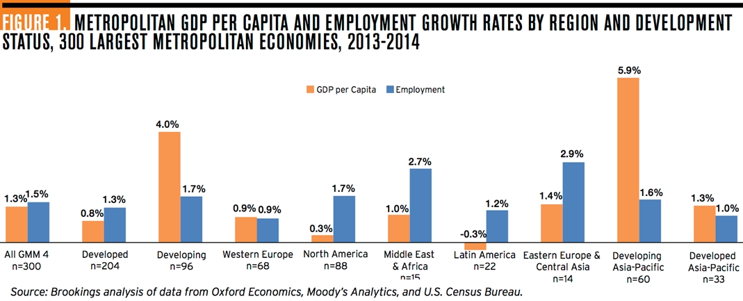 While employment creation was tepid, GDP per capita growth actually contracted by 0.3 percent, the only global region to experience a decline. This drop looks even starker compared to average GDP per capita growth in developing metro areas (4.0 percent).