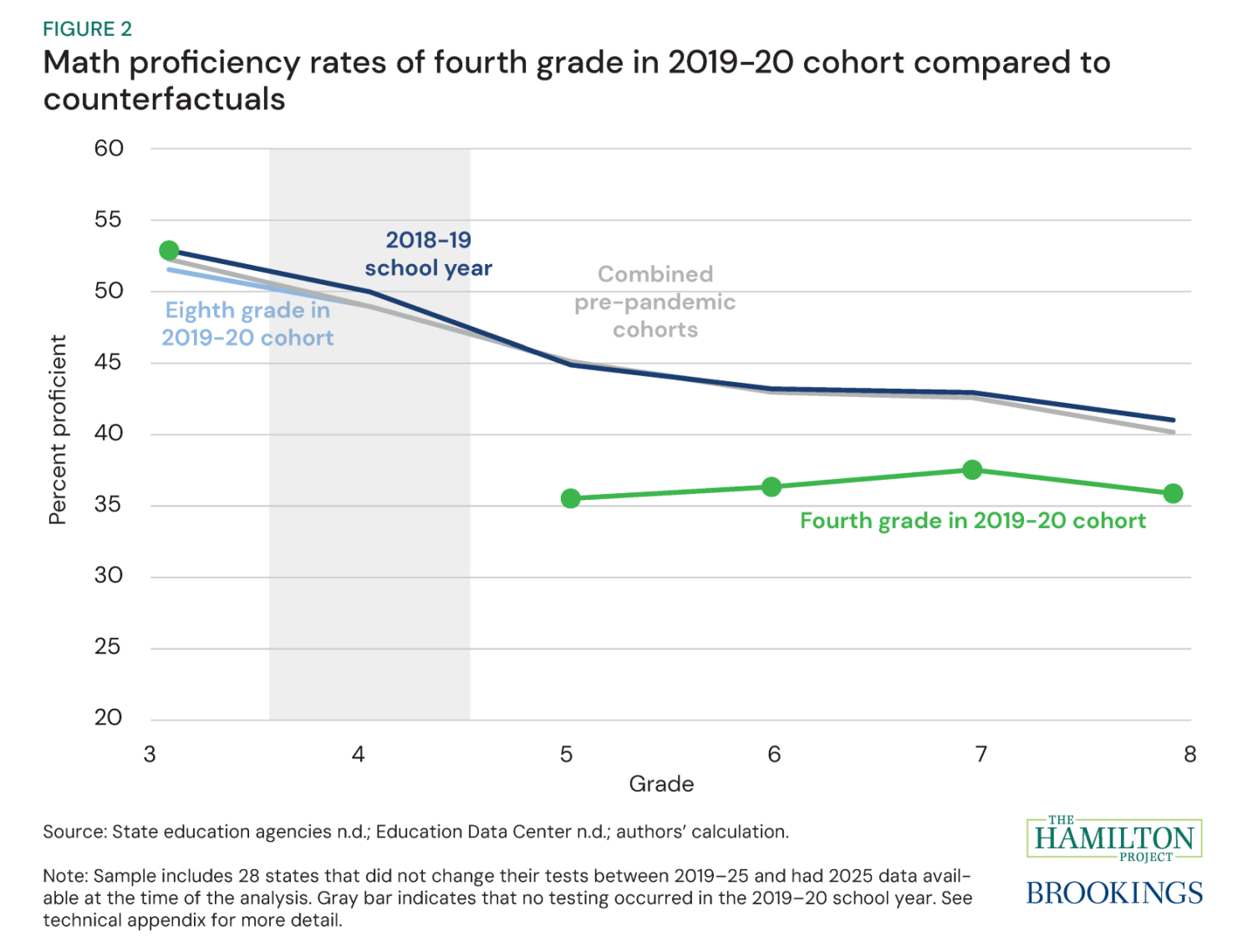 The grade(s) during which a student experienced COVID-related disruptions could affect student learning curves because—in addition to the unique learning circumstances for each child during this period—students build on prior knowledge, learn new material, develop skills, and grow with each day and with each successive grade in school. Changing proficiency rates over the course of schooling could also reflect changing standards or tests, differential attrition out of public schools, or learning loss.