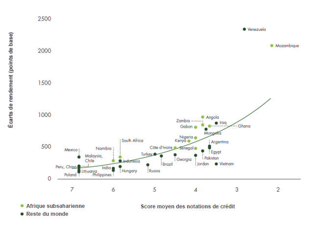 Les coûts d’émission de la dette des pays exportateurs de matières premières africains ont tendance à être plus élevés. Le graphique ci-dessous montre la relation négative existant entre les notations de crédit et les écarts de rendement des obligations souveraines. Comparés aux autres pays en voie de développement et émergents, les pays d’Afrique paient un écart plus élevé pour un risque de défaut de même niveau, tel que mesuré par les notations de crédit.