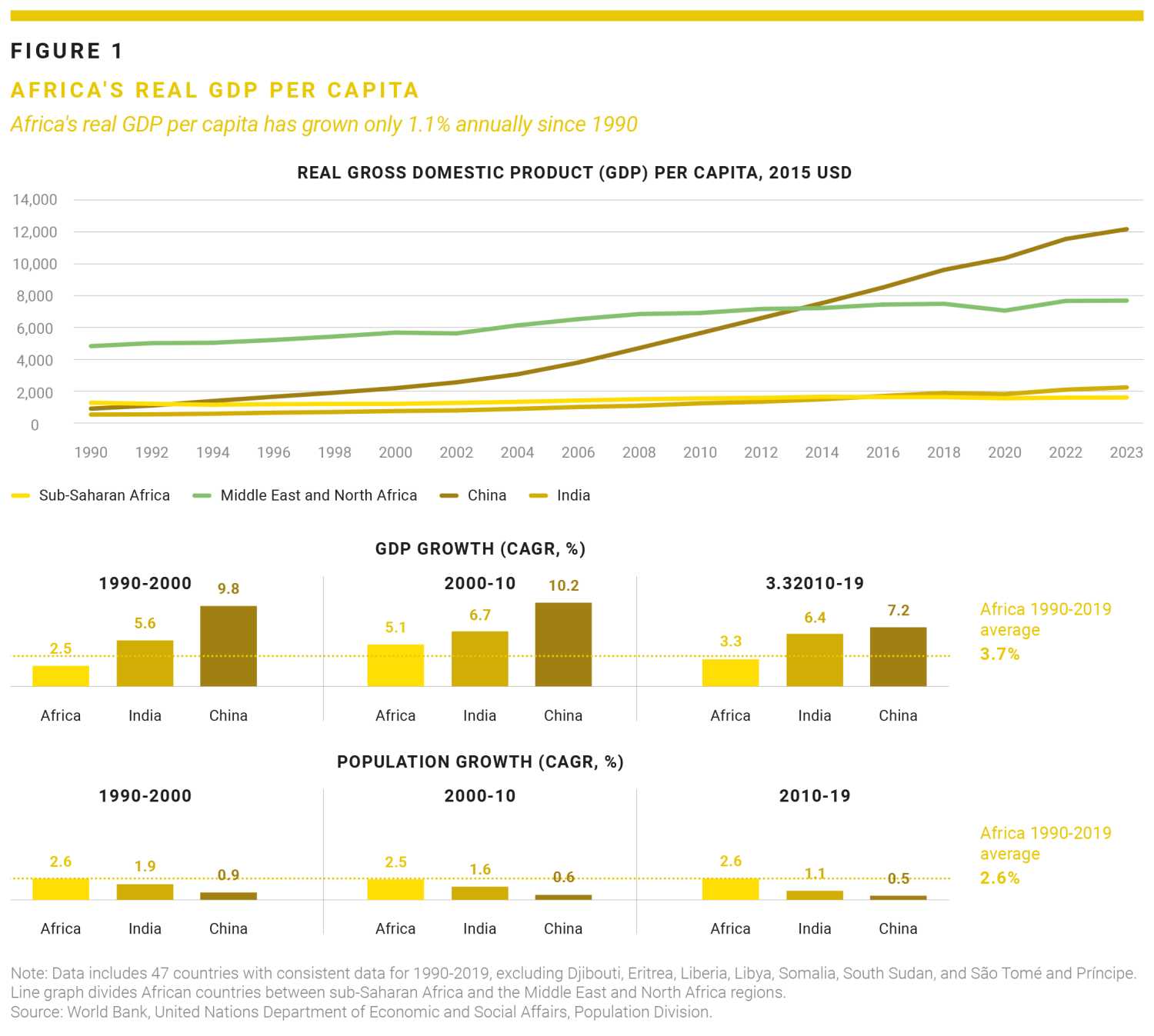 However, we approach these opportunities from a challenging starting point. Today, 60% of Africa’s population lives in poverty, the result of per capita income growth that has averaged just 1.1% a year for the past several decades (Figure 1).5 Unemployment of African youth sits at over 25% and more than 85% of Africans live with severe or moderate food insecurity.6 Low economic productivity across all sectors resulted in a 35% reduction in GDP growth over the last decade.7 Governance and the regional and national institutions at its foundations remain challenged across many parts of the continent. Investments in infrastructure and many critical social services (e.g., education and health) have fallen behind as fiscal headroom in many countries is under pressure.