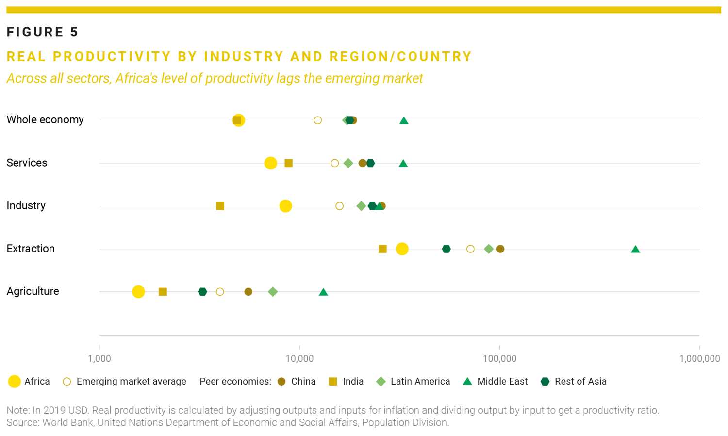 Since 2010, Africa’s economic progress slowed due to a confluence of factors ranging from waning demand for commodities to deteriorating economic fundamentals in the continent’s largest economies. All these developments coincided with and contributed to a steep decline in Africa’s annual productivity growth, which fell from 2.2% in the 2000-10 decade to 0.8% in the last decade.30 Africa’s economy is now the least productive relative to emerging market peers today (Figure 5).