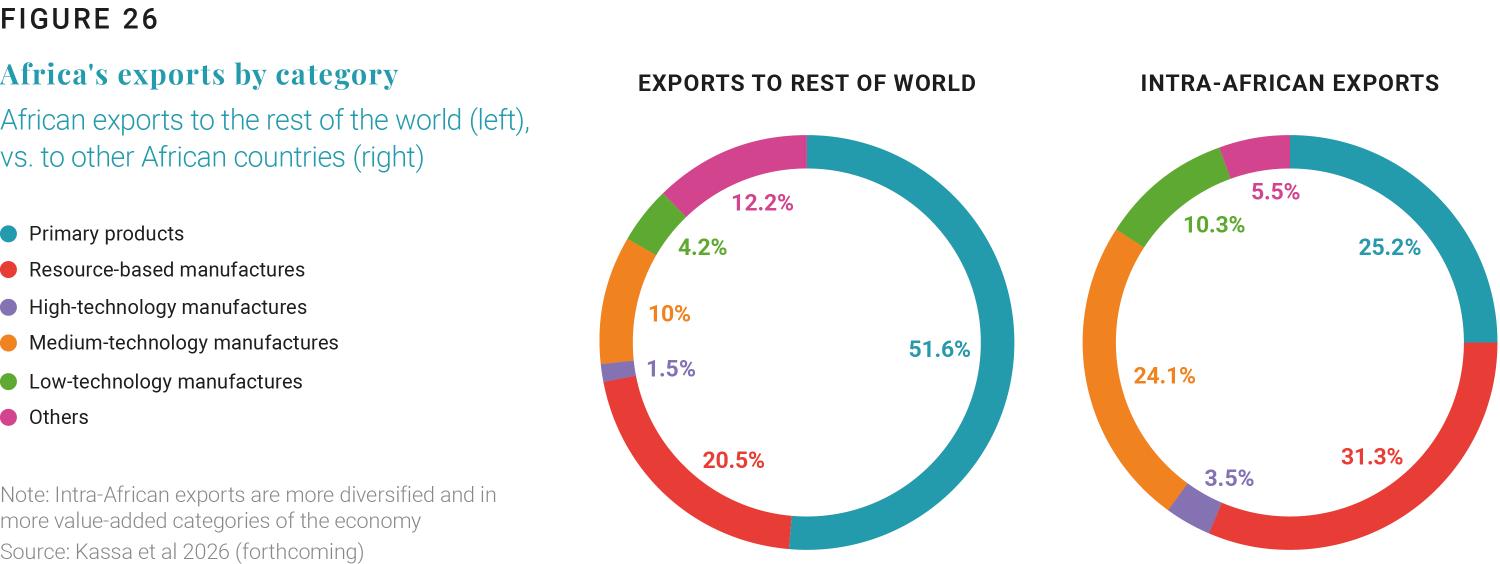 Intra-African trade centers on labor-intensive, value-added goods like processed food and light manufacturing (see Figure 25), which have high employment potential but limited global export share. “Small push” sectors (e.g., textiles) can easily scale within the region, while “big push” sectors (e.g., pharmaceuticals) need coordinated investment. Regional specialization, SADC in chemicals, ECOWAS in food, the Arab Maghreb Union in machinery, show that integration can foster complementary value chain hubs rather than competition.