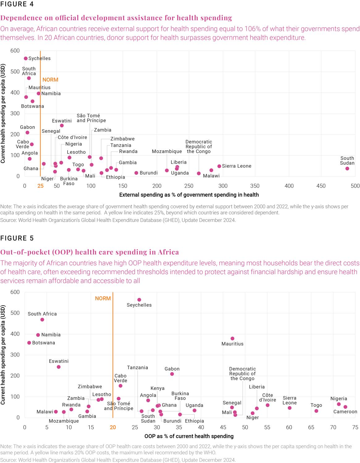 Compounding this problem is the fact that a decline in DAH may potentially increase out-of-pocket payments (OOP). OOP is a health financing channel that is regressive, discourages service use, and reduces financial protection for low-income and vulnerable groups. Based on the WHO’s recommendation that OOP should account for less than 20% of total health expenditure,27 81% of African countries have excessive OOP (Figure 5).