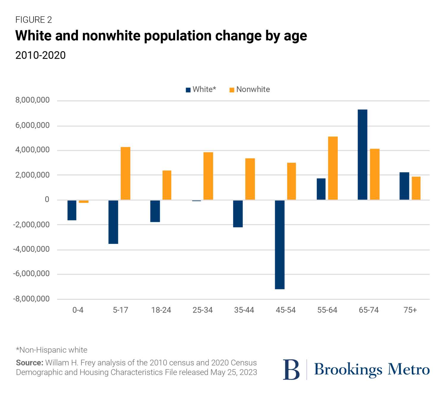 Among most age categories, nonwhite gains are attributable to larger numbers aging into the category (along with new immigrants) compared with the number aging out of the category. In the case of younger groups, a rise in births also contributes, although smaller numbers of births and reduced immigration in the latter half of the 2010s led to a decline in the under-5 population.