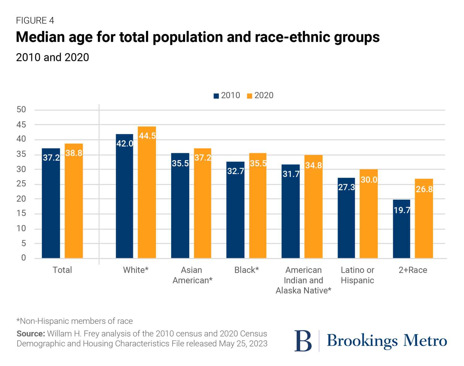 The more pronounced aging of the white population is also evident when comparing median ages across race and ethnic groups (see Figure 4). While the median age of all groups rose between 2010 and 2020, the white population continues to show the highest median age, at 44.5—nearly six years higher than the overall median age and 14 years higher than the Latino or Hispanic median age. This pattern is also true in most states and major metro areas (see downloadable Table E).