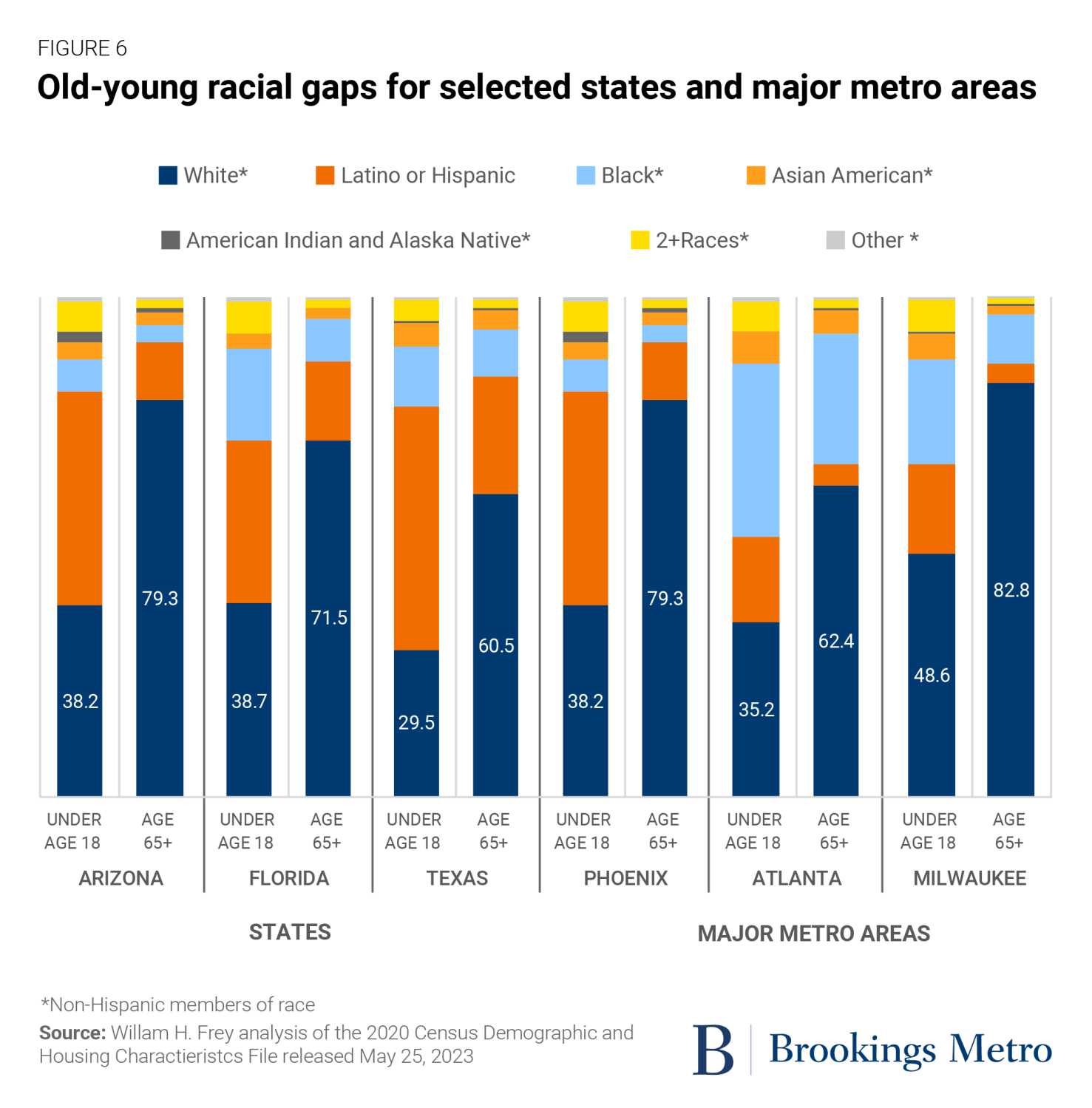 Among the 56 major metro areas, 17 have old-young racial gaps greater than 30 percentage points, and 37 of them have gaps greater than 25 percentage points. While Tucson, Ariz., Phoenix, and Las Vegas lead all others, high-gap metro areas are represented in all regions where different racial mixes prevail. This includes Atlanta, where the Black and Latino or Hispanic populations represent higher youth population shares, and Milwaukee, where the young population is more diverse than the predominantly white senior population.