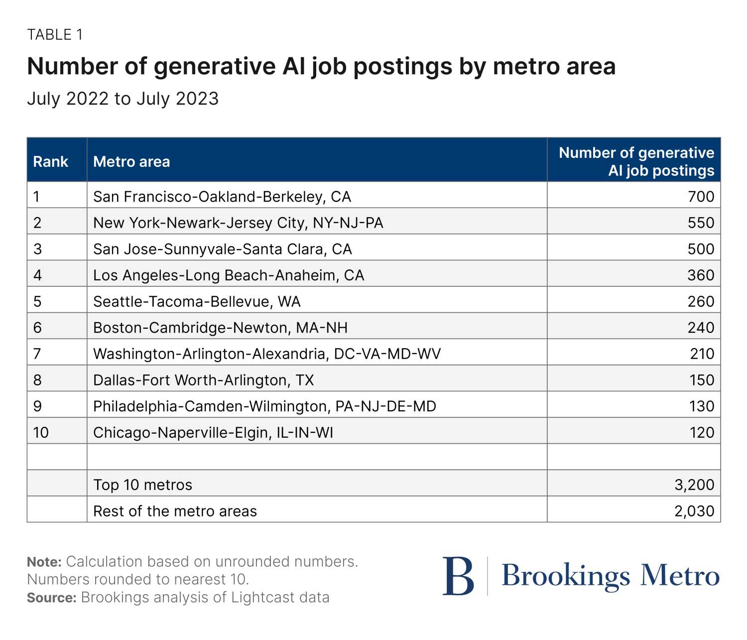 Nor does the prognosis seem hugely different for AI, although we are still in the technology’s early days. Brookings research from 2021 showed that the Bay Area and 13 “early adopter” metro areas accounted for over half of the nation’s AI activity in federal contracting, conference papers, patents, job postings, job profiles, and startups. More recently, our July report found that nearly half of job postings for generative AI positions over the prior the 11 months were concentrated in just six large coastal metro areas: San Francisco, San Jose, Calif., New York, Los Angeles, Boston, and Seattle.