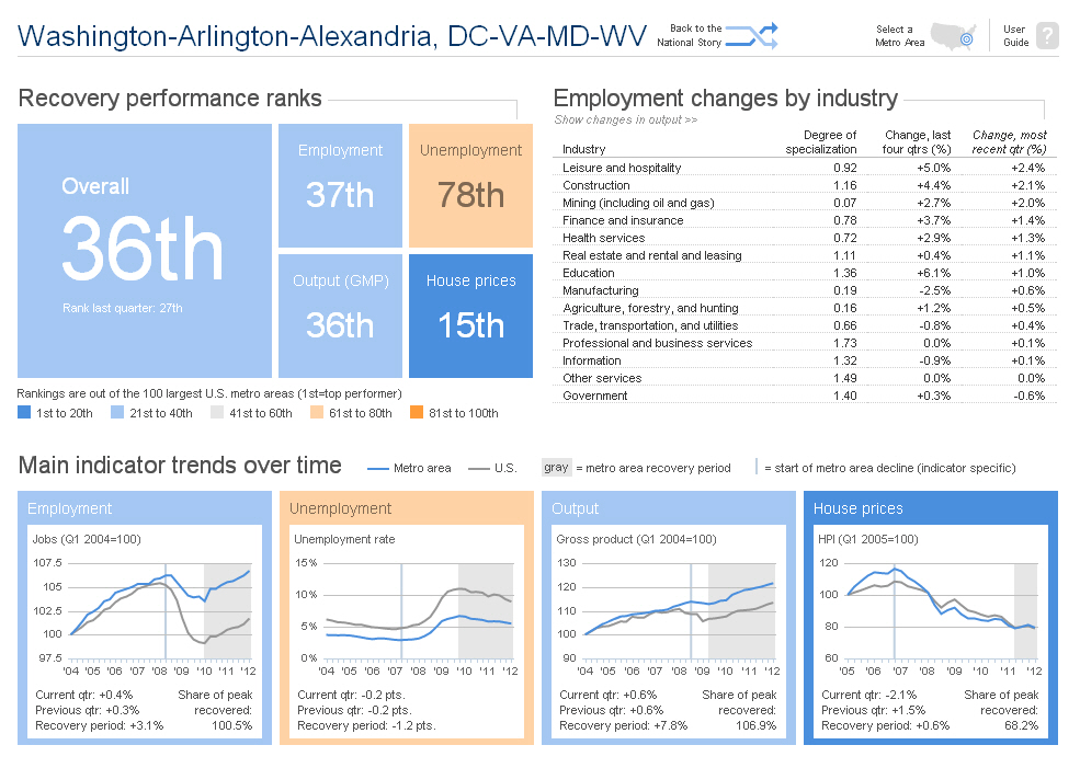 The new web-based tool provides not only a more interactive way to track trends in U.S. metropolitan areas but also significantly more and better information, including industry dynamics and richer visualizations of each metro area’s economic recovery.