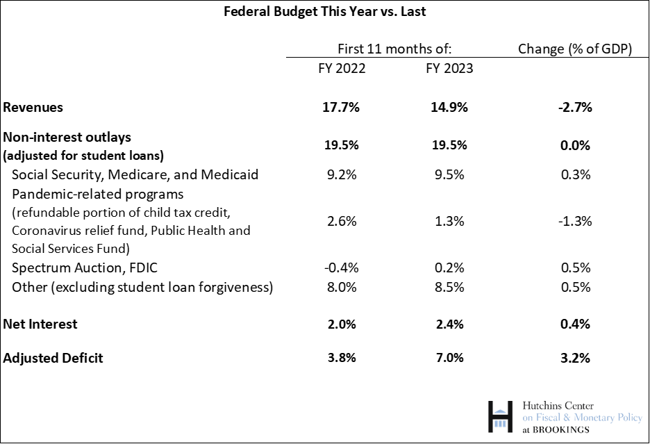 Meaningful comparisons between this year’s deficit and last year’s require an adjustment for the rise and fall of President Biden’s student loan forgiveness plan. In September 2022, CBO increased its estimates of federal outlays for fiscal year 2022 to reflect the cost of the loan forgiveness (which was calculated as the present value of the loan repayments that would have been forgiven under the Biden plan.) Then the Supreme Court ruled the plan was unconstitutional. So, in August 2023, CBO recorded a reduction in outlays in FY 2023 essentially reversing its previous accounting. That reduction in outlays sharply reduces this year’s deficit. Excluding this outlay reduction, the deficit in the first 11 months of FY 2023 is actually 7% of GDP—almost twice as large as in the same period in FY 2022.