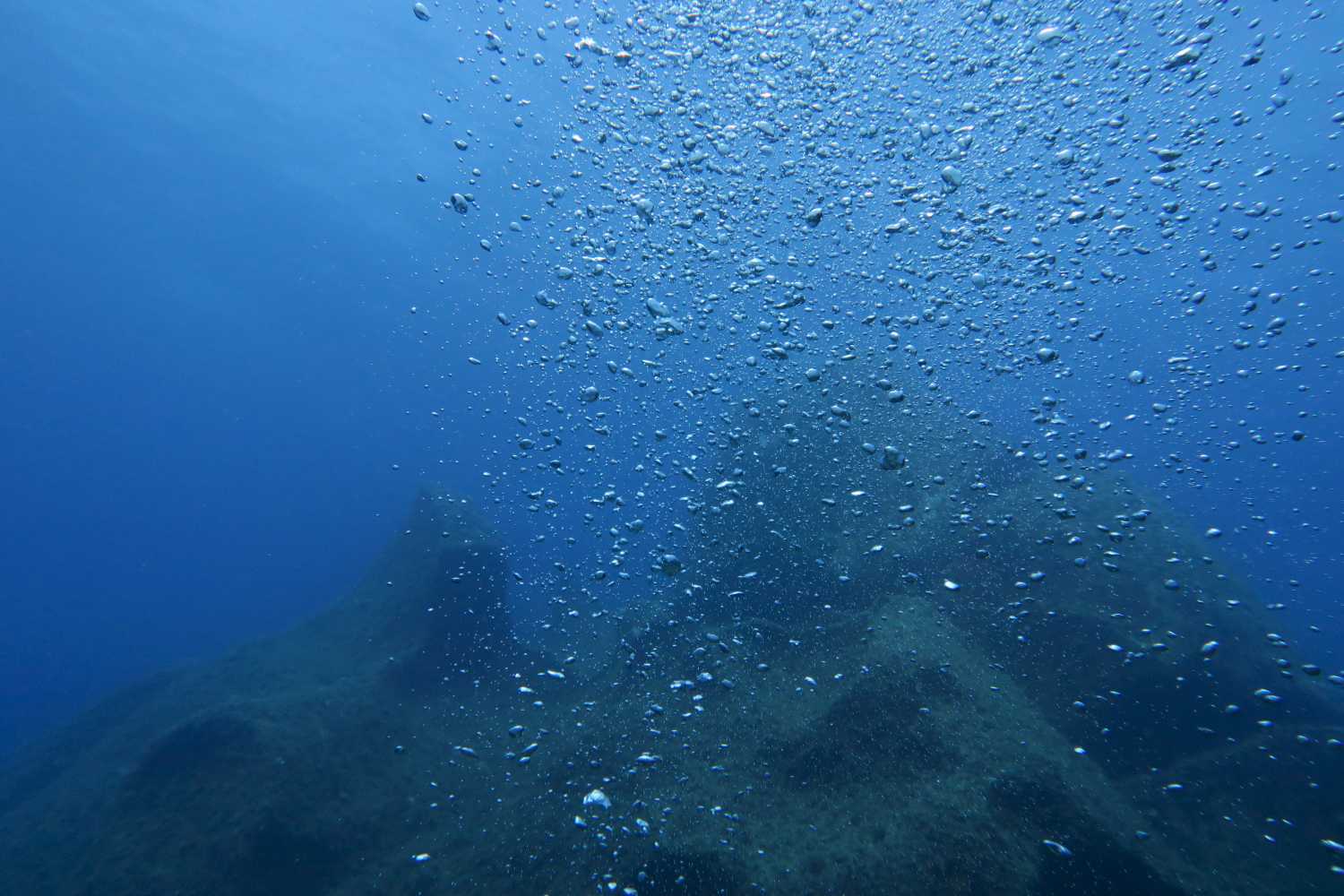 Bubbles from a scuba diver rise towards the surface near rock formations in the waters near Porticcio, on France’s Mediterranean island of Corsica (REUTERS/John Schults)