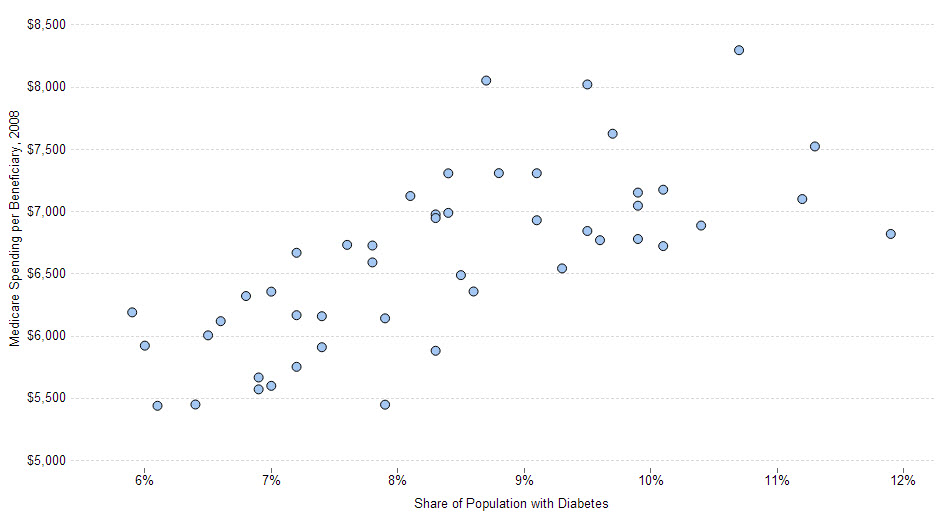 Also, visit this interactive chart, showing the relationship between Medicare spending and health for each state (using the proportion of the state’s population with diabetes as a proxy for general health).