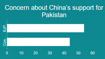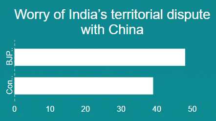 Fourth, while public opinion is generally wary of China, perspectives are sharply divided along partisan lines. For example, 54 per cent of BJP supporters are concerned about China’s support for Pakistan, compared to just 44 per cent of Congress supporters. Similarly 48 per cent of BJP backers worry about India’s territorial dispute with China, compared with only 39 per cent of those supporting Congress. This suggests that forging a national consensus on India’s China policy could be challenging in the coming years.