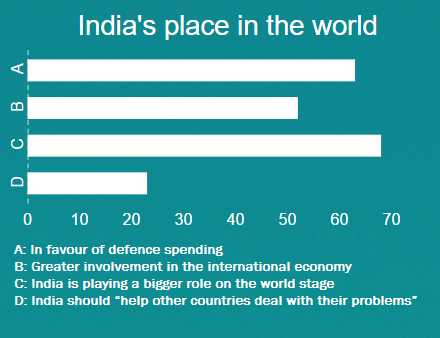 Finally, it is noteworthy that Indians seem conflicted about the country’s global role. The survey reveals that average Indians are very much in favour of defence spending (63 per cent) and greater involvement in the international economy (52 per cent), and they believe overwhelmingly that India is playing a bigger role on the world stage (68 per cent). However, they do not yet believe that Indian power should be used to “help other countries deal with their problems” (23 per cent). But perhaps these views – both pride and caution about a greater international role – are normal for a rising power such as India.