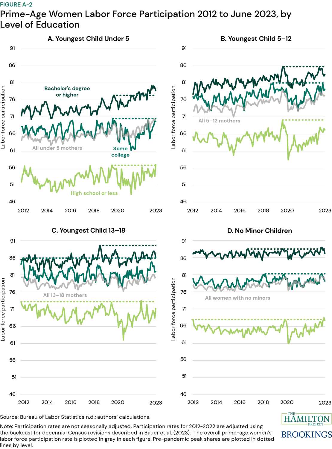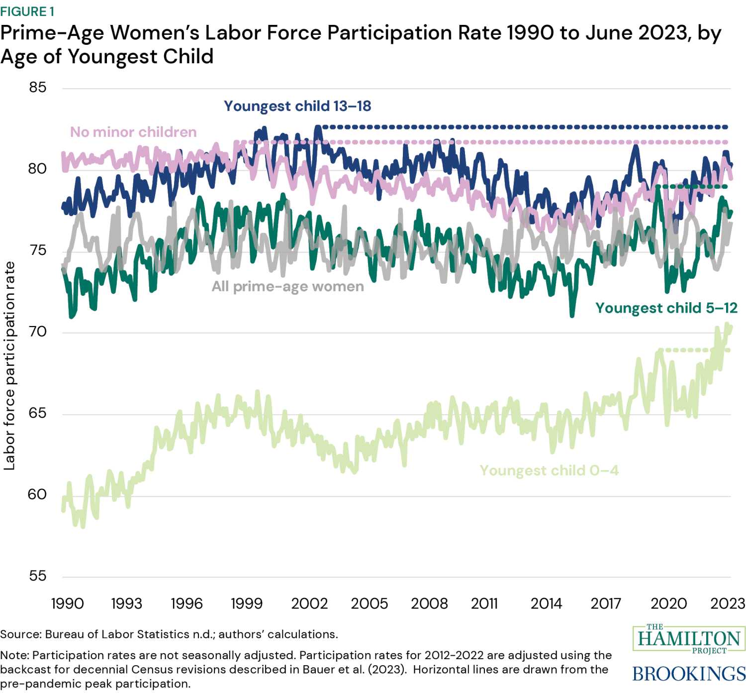 In 2017, The Hamilton Project published “The 51 Percent: Driving Growth through Women’s Economic Participation” premised in the idea that the U.S. economy’s potential cannot be realized unless women who want to participate in the labor market can do so fully. To spur labor force participation, strengthen work supports, and increase access to high quality affordable child care, The Hamilton Project has offered many proposals to address child care-related challenges (by Elizabeth Cascio, Elizabeth Cascio and Diane Schanzenbach, Bridget Terry Long, Aaron Sojourner and Elizabeth Davis, and James Ziliak) and provide paid leave (by Tanya Byker and Elena Patel, Nicole Maestas, and Christopher Ruhm).