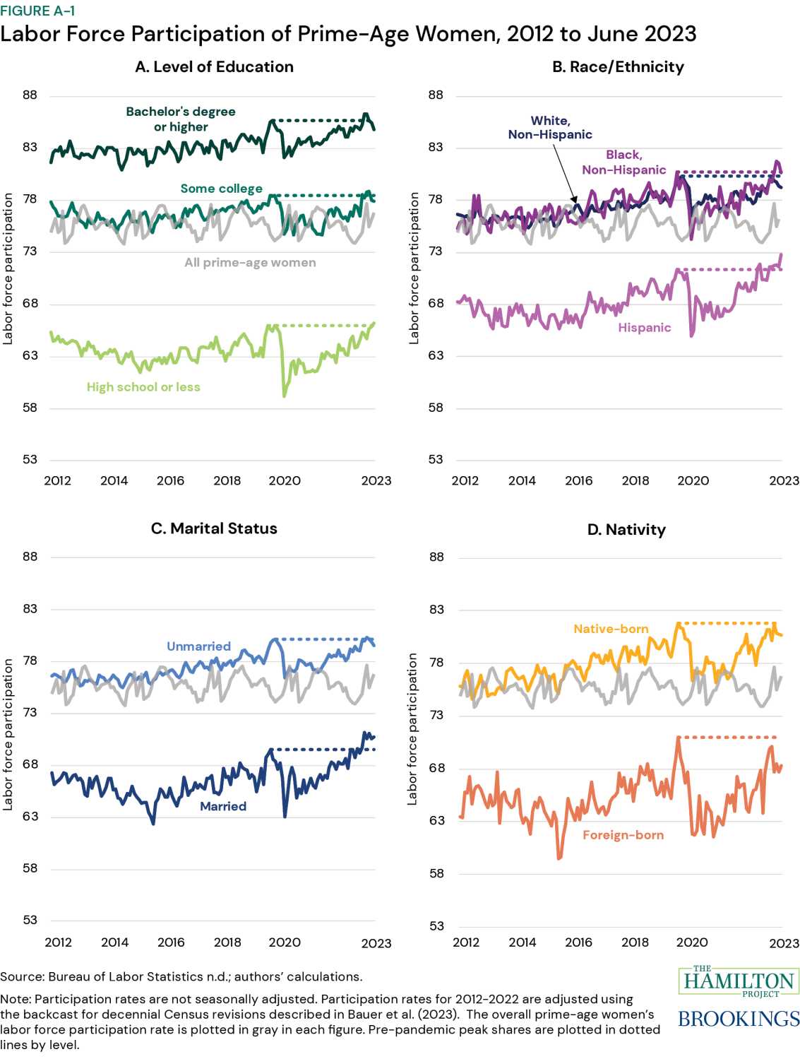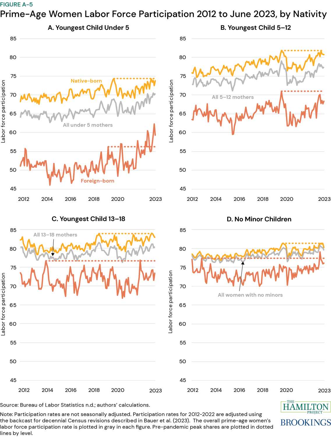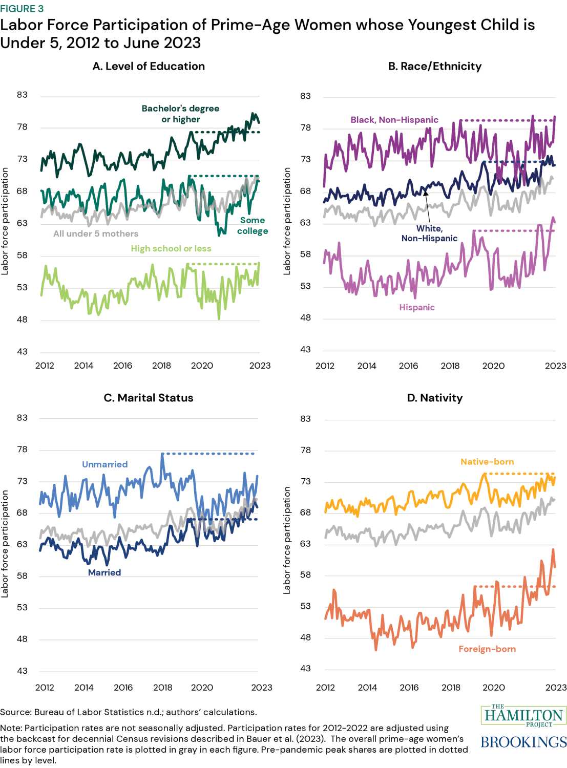 Finally, figure 3-D breaks participation rates for mothers with young children by their nativity, (i.e., whether they were born in the U.S. or not). Others have speculated that substantial growth in foreign-born participation has made up for a slower recovery among those who were born in the US. In fact, women with young children who were born outside the U.S. are currently exceeding their pre-pandemic peak participation rate, though foreign-born prime-age women on the whole are not. Foreign-born mothers with at least some college education and those who are Asian are participating substantially more than they were before, perhaps reflecting changes to immigrant work authorization rules that would allow spouses of H-1B holders to hold jobs.