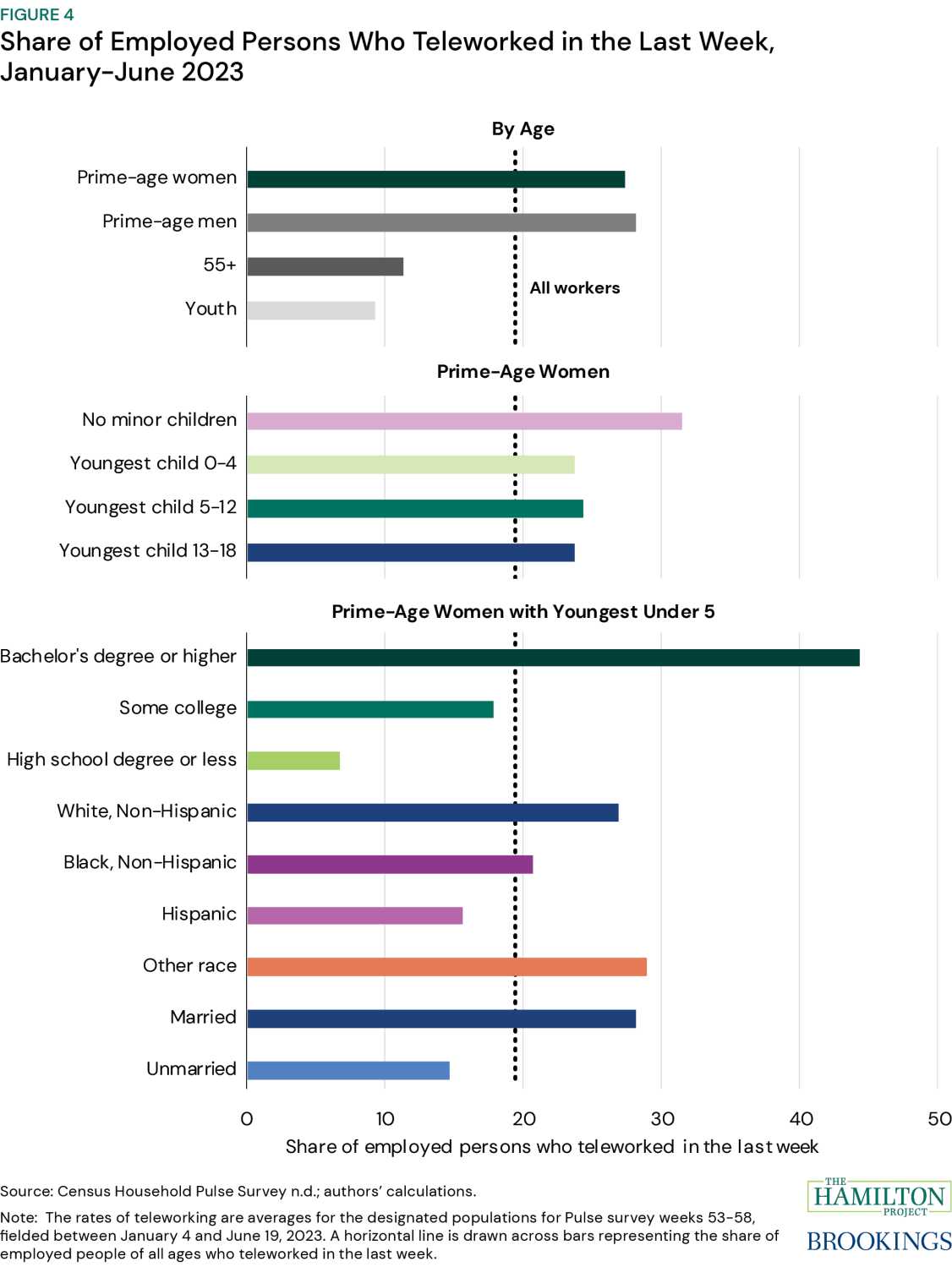About a quarter of prime-age women with children, regardless of the age of their youngest child, report working from home in the first half of 2023. Looking just at differences in telework among mothers with young children, figure 4 shows that well-educated women (44 percent) and married women (28 percent) are much more likely than the average worker to say that they are continuing to telework at least once a week.