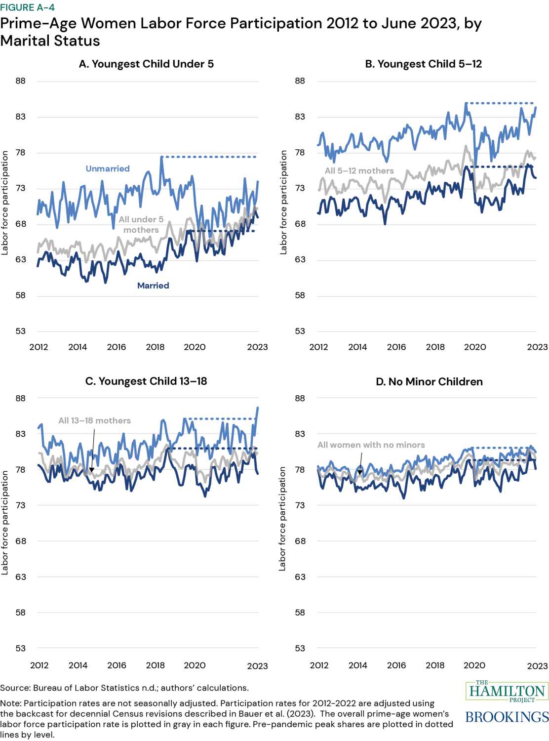 Differentiating by marital status for mothers with young children (figure 3-C), we find that the labor force participation rate of married and unmarried mothers with young children is moving toward convergence. From 2016 through 2019, the average labor force participation rate for married women with young children was 63.2 percent and for unmarried women with young children was 72.6 percent. In the first six months of 2023, married women with young children had a labor force participation rate of 69.0 percent, and it was 72.1 percent for those unmarried. This convergence appears to be happening only among mothers with young children (see appendix figure A-4).