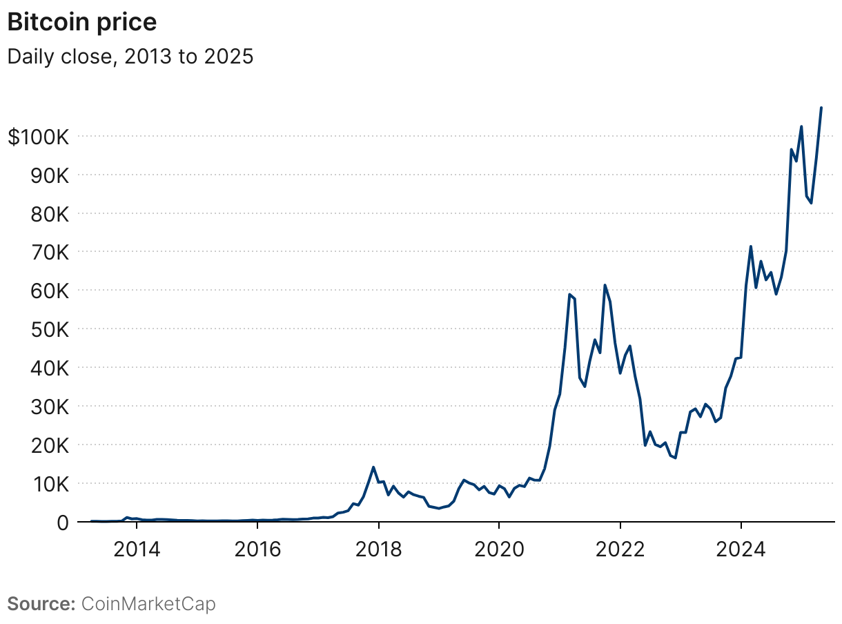 Today’s crypto policy choices are not being developed in a vacuum. Instead, these decisions are occurring against the backdrop of rising bitcoin prices (Figure 1) and a regulatory environment where oversight is weakening and political entanglements are deepening—raising legitimate concerns about regulatory capture, ethical conflicts, and public accountability.