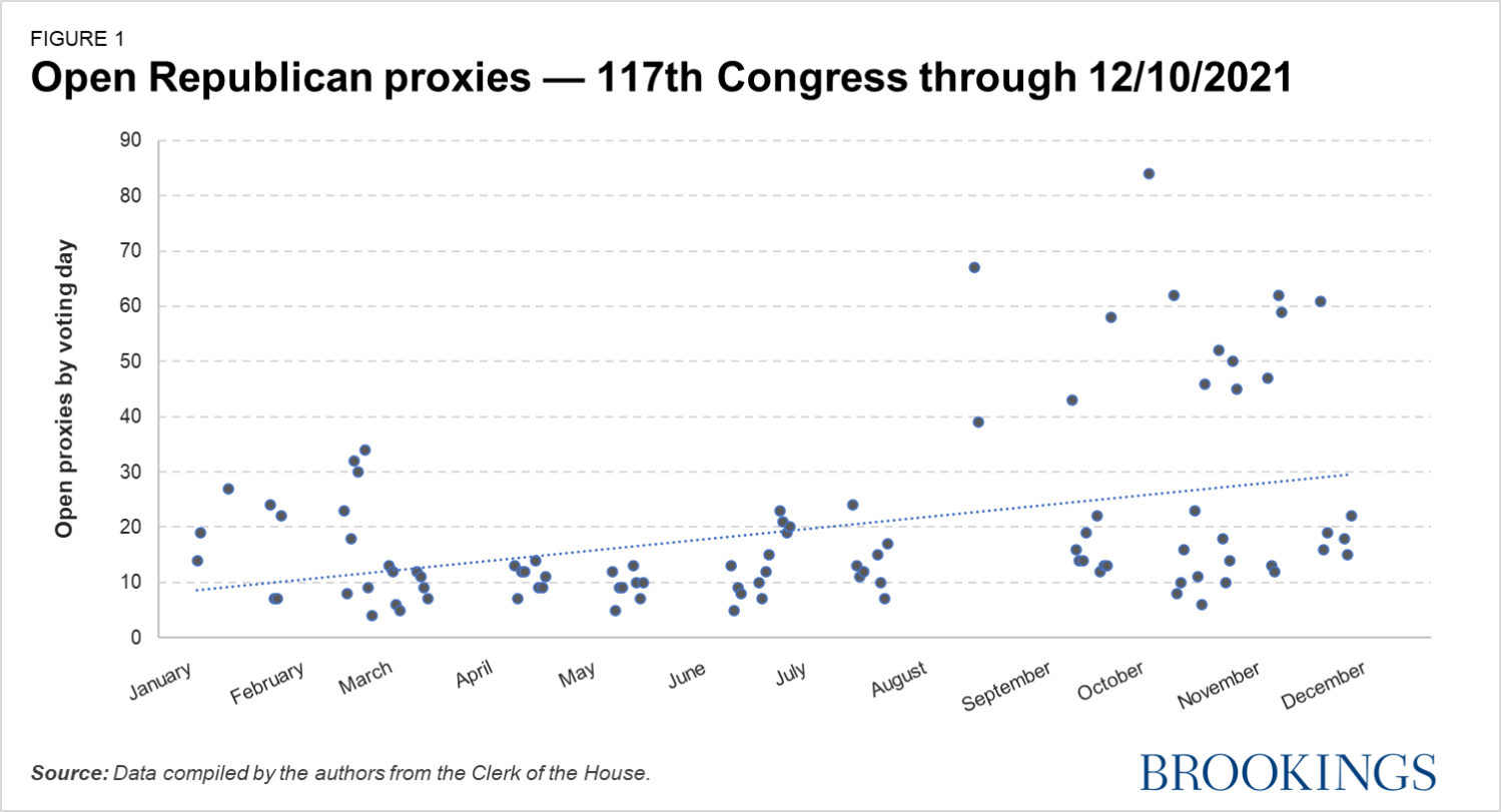 Importantly, certain votes have seen exceptionally high numbers of proxy voters. The November vote on the Build Back Better legislation, for example, saw very high usage of proxy voting despite being one of the most significant votes of the year. Notably, 56% of the 98 members who used a proxy during this vote were Republican.