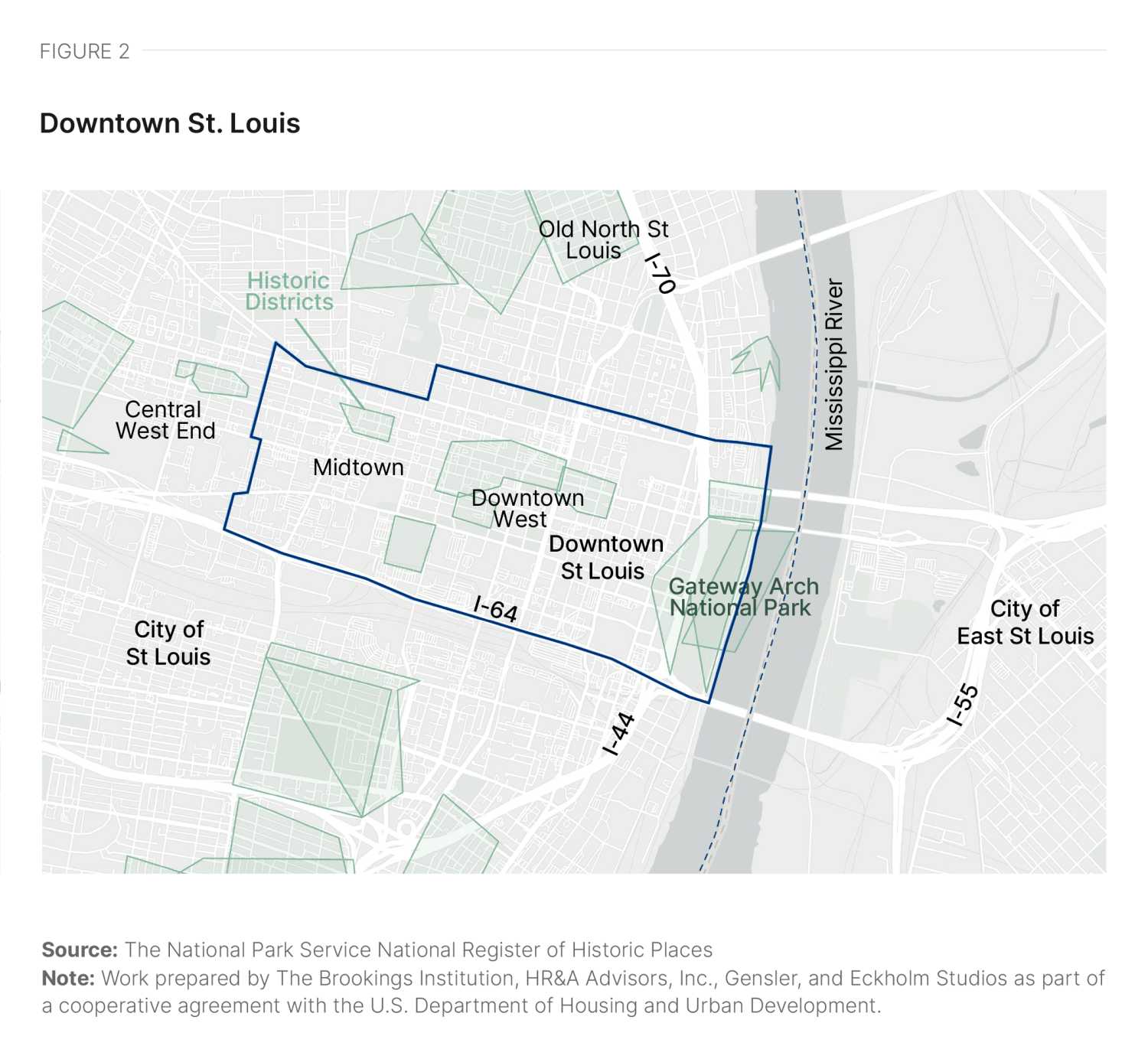 Downtown St. Louis covers an area of 1.9 square miles, from the Mississippi riverfront to T.E. Huntley Avenue, and bounded by Dr. Martin Luther King Drive and Cole Street to the north and I-64 to the south (Figure 2). Historically a working waterfront, St. Louis’ downtown concentrated commercial uses as the city rapidly grew within its fixed boundaries through the 19th and 20th centuries. Several rounds of rebuilding characterize the city and its downtown, leaving a distinctive mark on historic architecture. The fire of 1849 destroyed 15 city blocks of the central business district and some of the city’s oldest buildings, after which new buildings used more fireproof materials, such as brick with stone or cast iron facades.