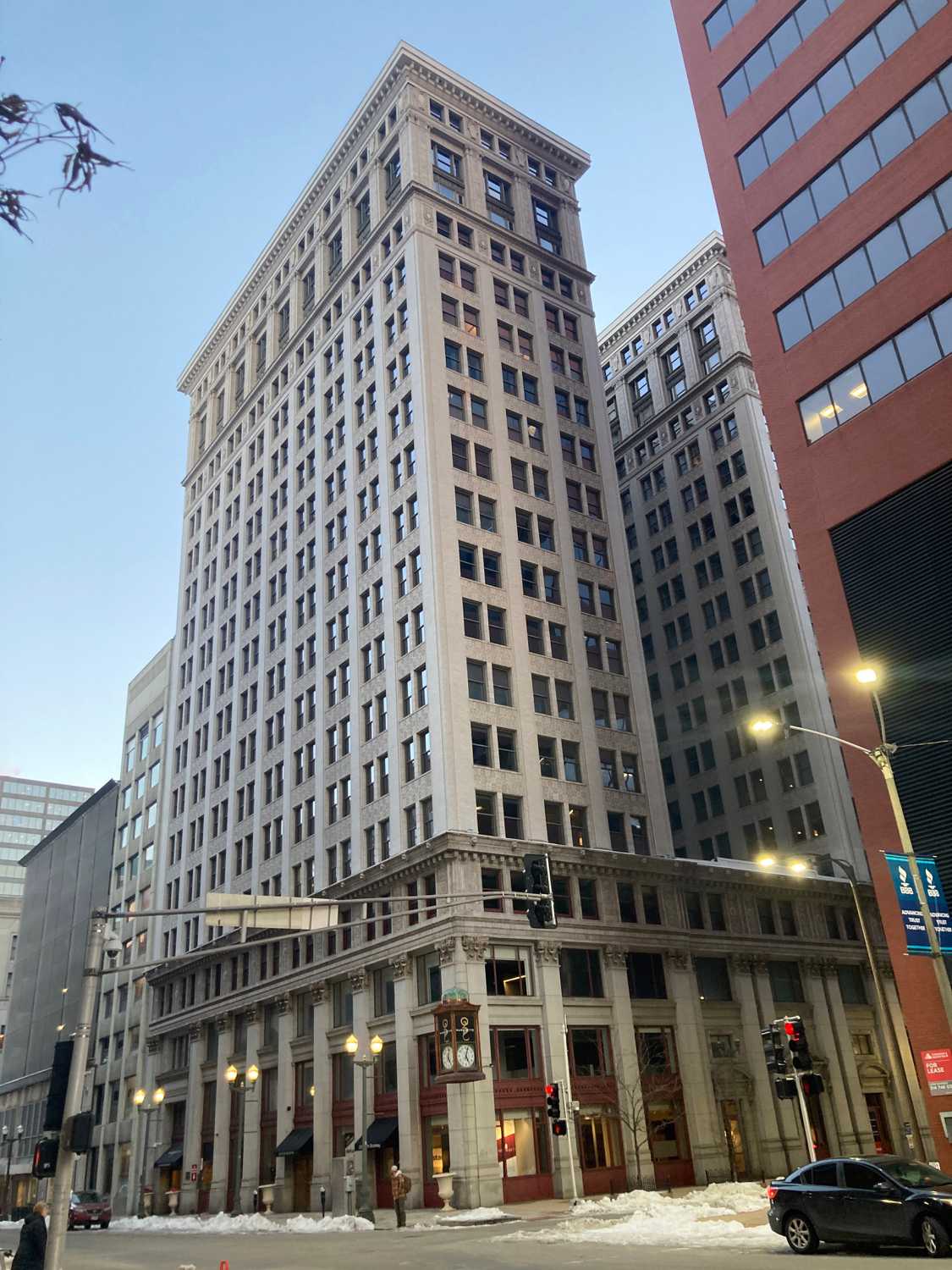 601-615 Olive St. sits centrally in the block between Locust Street/Olive Street and N. Seventh Street/N. Sixth Street. Built in 1913, it is a 21-story structure with a gross area of 1,153,995 square feet. Due to its varying floor plate sizes and different features, the building is studied in three parts.