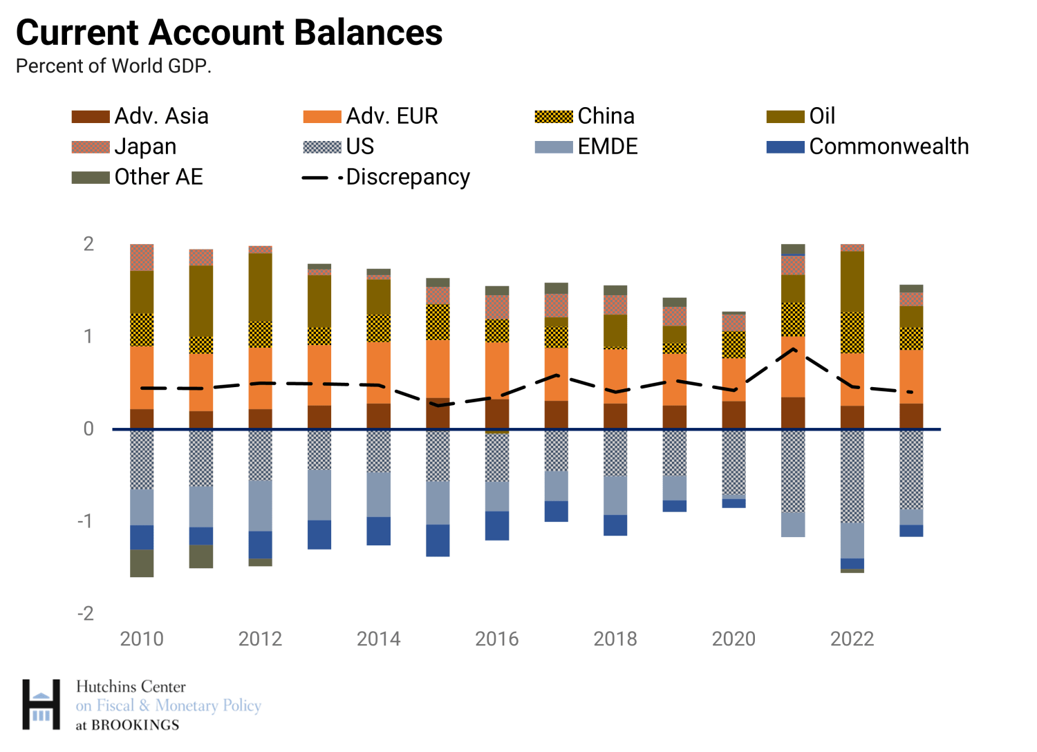 Among other factors driving external positions, current account imbalances, which measure net borrowing and lending and hence contribute to global creditor and debtor positions, declined in 2023 relative to 2022 (see figure below), primarily because of falling energy prices. And relatively high inflation contributed again to lower creditor and debtor positions in relation to GDP by increasing the denominator of the ratio, tempering the impact of higher equity valuations.