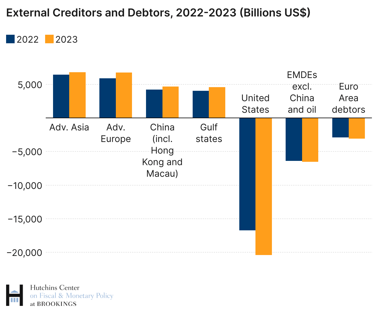 Both advanced Asia and advanced Europe had creditor positions of around $6.8 trillion at the end of 2023, while greater China and Gulf states had creditor positions exceeding $4.5 trillion (with substantial uncertainty surrounding the figure for Gulf states, given the paucity of statistics on their external assets and liabilities).