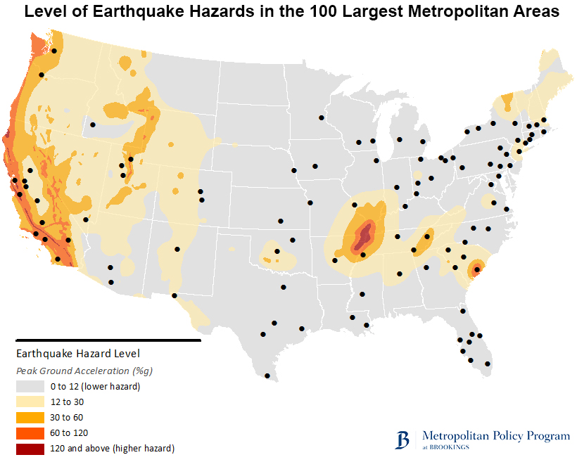 Note: As noted by USGS, colors on this map show the levels of horizontal shaking that have a 2 percent chance of being exceeded in a 50-year period. Shaking is expressed as a percentage of g, which refers to the acceleration of an object due to gravity. Values may vary within individual metro areas.