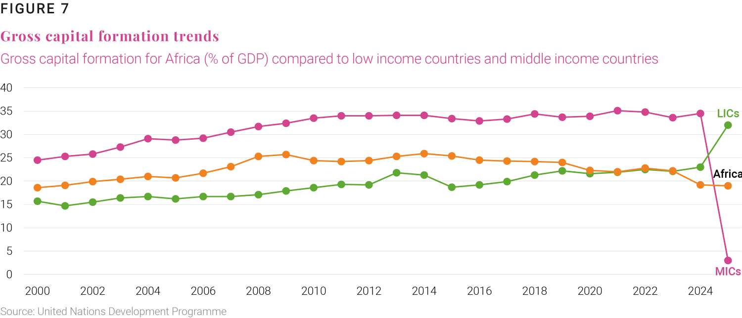 As of end October 2025, only three of the rated 34 African countries are rated as investment grade.9 Thus, borrowing for most of the continent attracts a premium (for the non-investment grade countries) or punitive rates (for the 38% of the continent that is unrated).10 Moreover, this elevated cost of borrowing is often misaligned with the region’s actual financial potential. For example, at 2.6%, default rates on infrastructure investments in Africa are among the lowest in the world.11 Costly financing is also causing a slowdown in Africa’s gross capital formation, which is far below the average of 33% for middle-income countries.12 Yet Africa must invest more if it is to grow. Investment delayed could be development denied.