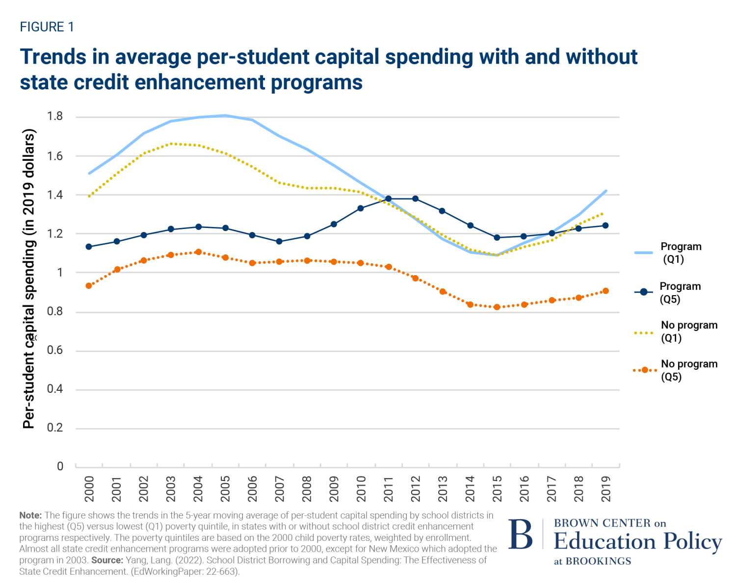 Therefore, the availability of state credit enhancement may help explain the recent convergence in capital spending between high- and low-income districts since the demise of private bond insurance companies in 2008. Figure 1 shows that in states without credit enhancement programs, the trends in capital spending are similar for districts in the highest- versus lowest-poverty quintiles: both decreased starting in 2003 and continued to drop after 2008, with low-poverty districts consistently spending more. In contrast, in states offering credit enhancement, low-poverty districts decreased capital spending after 2008, while spending by high-poverty districts remained stable, leading to a reversal in the capital spending gap.
