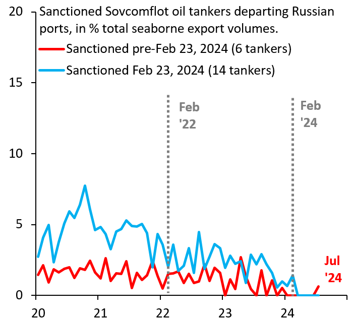 Several developments in Russia’s oil trade suggest Western sanctions are hampering Putin’s ability to profit from oil exports. First, a sanctioned Russian ship reemerged as an active tanker this July, the first time there has been such a reappearance in our data since the U.S. sanctioned 14 further Sovcomflot ships in February (Sovcomflot is the largest state-owned shipping company in Russia). Second, July saw an unprecedented shuffling of activity within the Sovcomflot fleet, with a shift toward less-heavily used ships. Third, Russia’s seaborne oil export volumes are down versus last year, and volumes carried on Sovcomflot ships have been falling steadily. Fourth, and perhaps most importantly, the average number of departures per ship declined.1 As we explain below, these developments are a sign of mounting strain on Russia’s shipping operations. Limited oil tanker capacity remains Russia’s Achilles’ heel, which the West can exploit through further sanctions and enforcement.