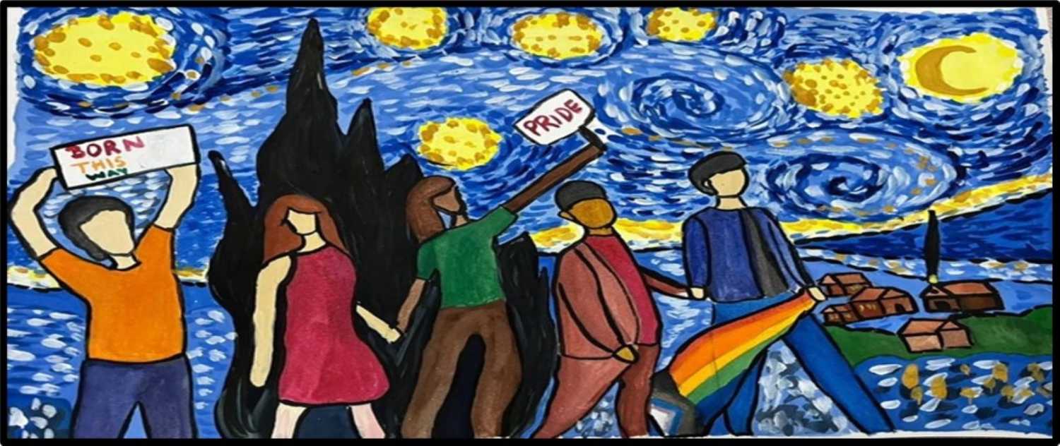 - Provide a comfortable, relaxed, and creative means of expression, thereby making the sensitive topic of GBV less traumatizing for them. In the first stage, self-identified victim-survivors were asked to express their emotions about their experiences via any art form of their choosing (for ex: painting, poetry, sketching, zines, music, etc.), which was later used as an ice-breaker to initiate the narrative interviews. Ahana (pseudonym), a queer student in her final year of college, shared the therapeutic and empowering effect that working on her art form Queer Solidarities had on her. “It had been long that I have sketched something, and to do it about my experiences with GBV as a queer student here, that was just so affirming. [I felt] like someone wanted to listen to me. I cannot wait to discuss my artwork with you tomorrow,” she wrote to me before the interview.