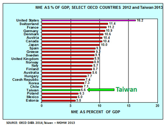 Total health spending in Taiwan in 2013 was 6.63 percent of Taiwan’s GDP, of which the NHI accounted for 52.2 percent. Out-of-pocket spending by the insured accounted for another 35.8 percent, government public health and general administration expenditures 6 percent, and health care investments 5.4 percent.[3] This is low compared to OECD countries where the average health spending was 9.3 percent of GDP in 2012 (Figure 1). Pubic satisfaction with the NHI has been high, averaging in the 80 percent range in recent years.[4] Waiting lines for visits and procedures, if any, are short, and patients have free choice of providers, as there is no gate-keeper system such as that in the UK’s National Health Service or in American HMOs.