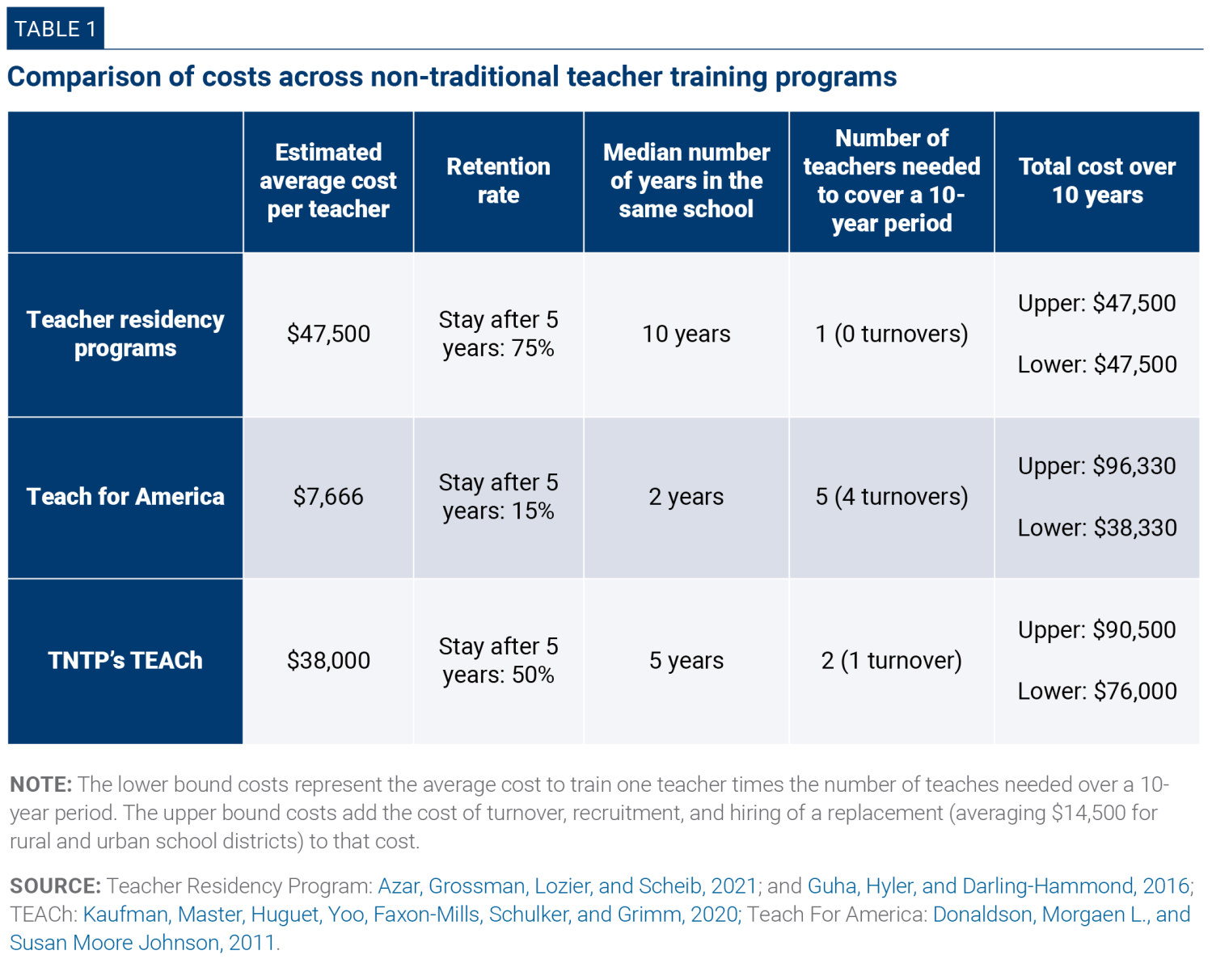 Implementation research suggests that residency programs often require significant upfront investments from districts. But we also know that high rates of turnover are costly for districts. Thus, whether TRPs pay off in the long run hinges on retention rates for TRP-trained teachers relative to teachers trained through other alternative or traditional certification programs. To illustrate this point, we present a simple stylized cost analysis comparing long-run costs of TRPs relative to two other popular programs that prepare teachers to work in similar high-needs settings: Teach For America (TFA) and a grow-your-own program, TEACh.