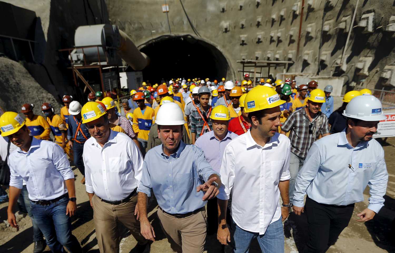 Rio de Janeiro's Mayor Eduardo Paes (C) and Rio de Janeiro's Governor Luiz Fernando Pezao (2nd L) leave one of the two tunnels on the Transolimpica freeway route, which will connect the Rio 2016 Olympic Park and the Deodoro Sports Complex, in Rio de Janeiro, Brazil August 4, 2015. The transportation project is being carried out for the city's redevelopment ahead of the 2016 Olympic Games. REUTERS/Ricardo Moraes - RTX1N13J