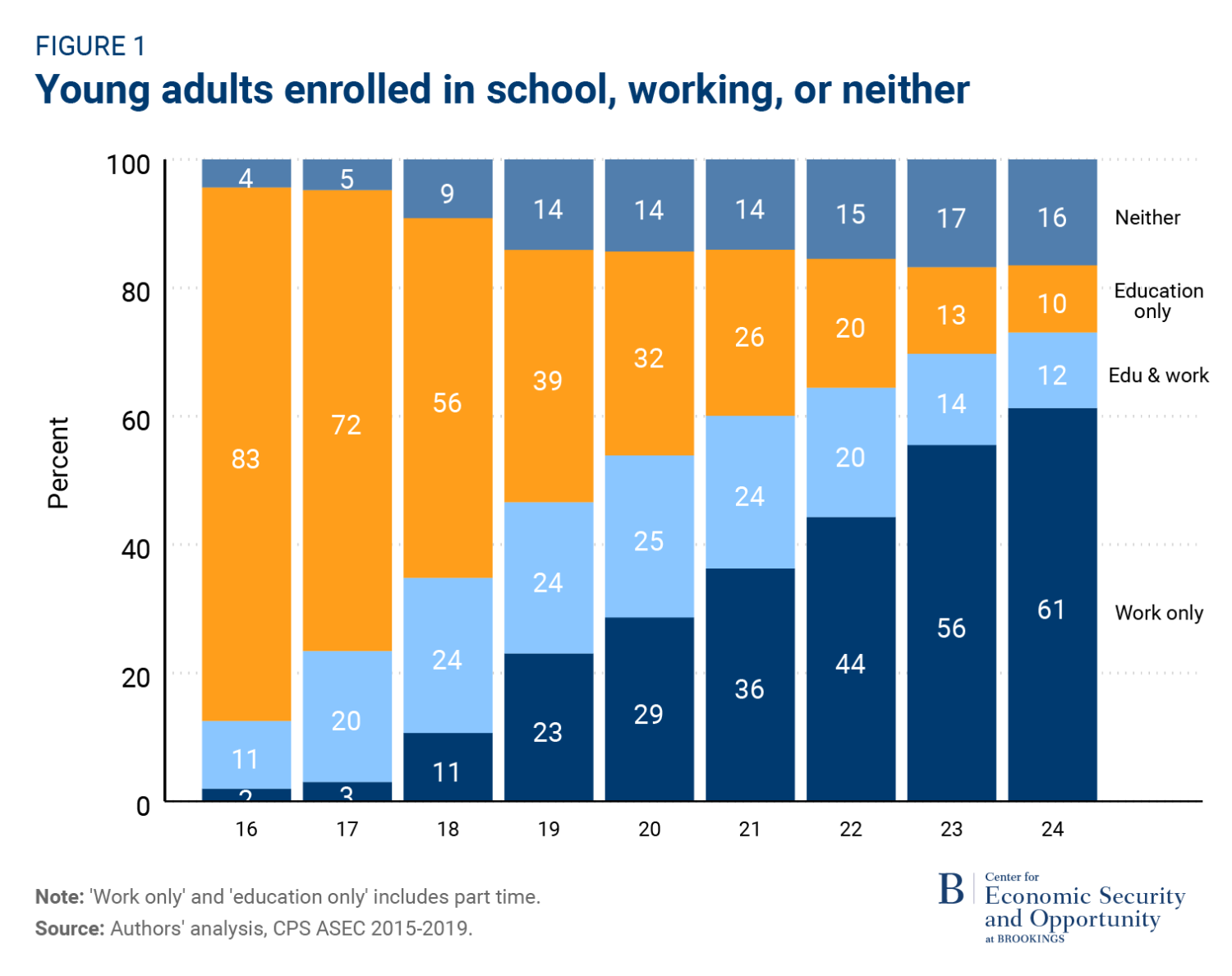 At age 16, when young people are still typically living with their guardians and going to school, almost all (94%) are enrolled in school. As Figure 1 shows, as they age and finish compulsory schooling, more young adults begin to work, or become disconnected (i.e., neither working nor enrolled).