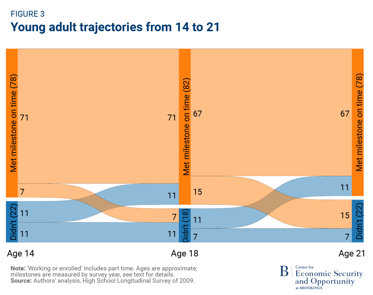 While missing a milestone in adulthood does not lock in later-in-life outcomes, there is a clear relationship between passing one milestone and time and doing the same later on. This emphasizes the importance of investing in young adults early.