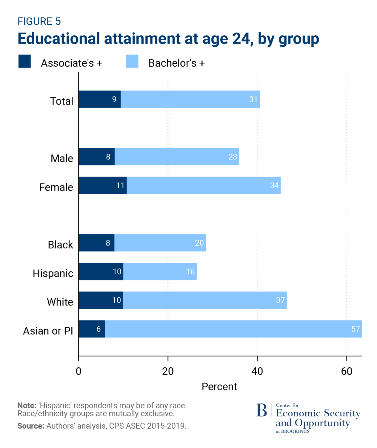 The large differences by race and gender in GPA, high school completion, and college enrollment throughout adolescence and early adulthood are clear in educational attainment at age 24. As Figure 5 shows, young women have higher levels of educational attainment than young men and are about nine percentage points more likely than men to have an associate degree or higher.