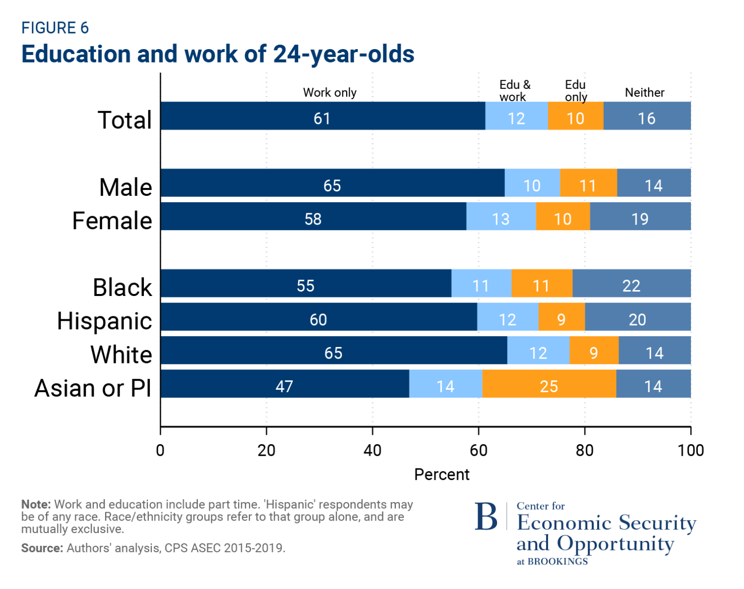Across ages 16 to 24, Asian or Pacific Islander are more likely to be enrolled in school alone than white, Black, or Hispanic young adults. Hispanic and Black young adults are also the most likely to be “disconnected” — that is, not enrolled in school nor working. However, for most of young adulthood, white young people are most likely to be both working and enrolled. By 24, disparities begin to crystalize; a fifth of Black (22%) and Hispanic (20%) 24-year-olds are neither working nor employed, compared to 14% of white and Asian 24-year-olds.