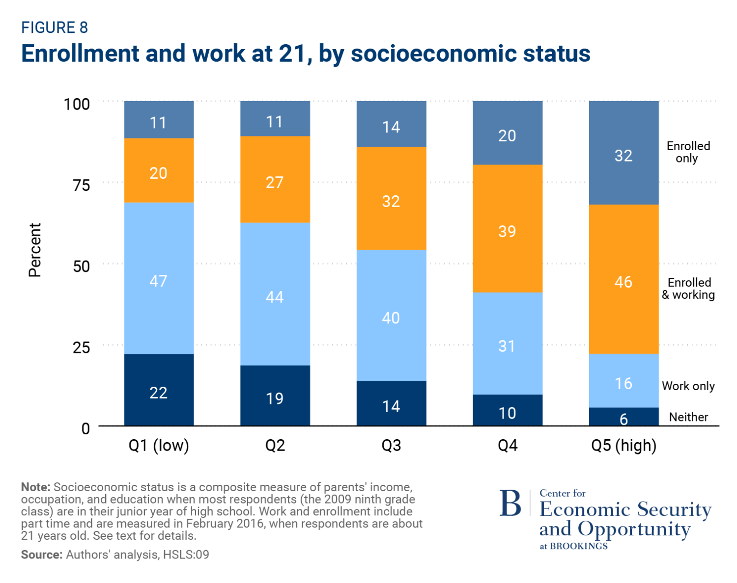 To examine the link between socioeconomic class and young adults’ engagement in work and school, we use the HSLS to show engagement three years after expected high school graduation2 (since we are unable to link young adults to their family of origin’s income in the CPS at the age of 24). Figure 8 shows that young adults who come from high-socioeconomic-status (SES) families are the almost three times more likely to be focusing entirely on school and more than three times less likely to be disconnected than their lower-SES peers at age 21. The difference between the top quintile and even the fourth quintile is stark: Top quintile young adults are about half as likely to be working only or disconnected than those in the fourth. It is relatively unusual for young adults from affluent families not to be in enrolled in college, but fairly common in the rest of the population.